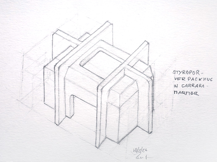 Entwurfszeichnung für eine Skulptur aus Carrara-Marmor, die sich an einer Polystyrol-Verpackung orientiert